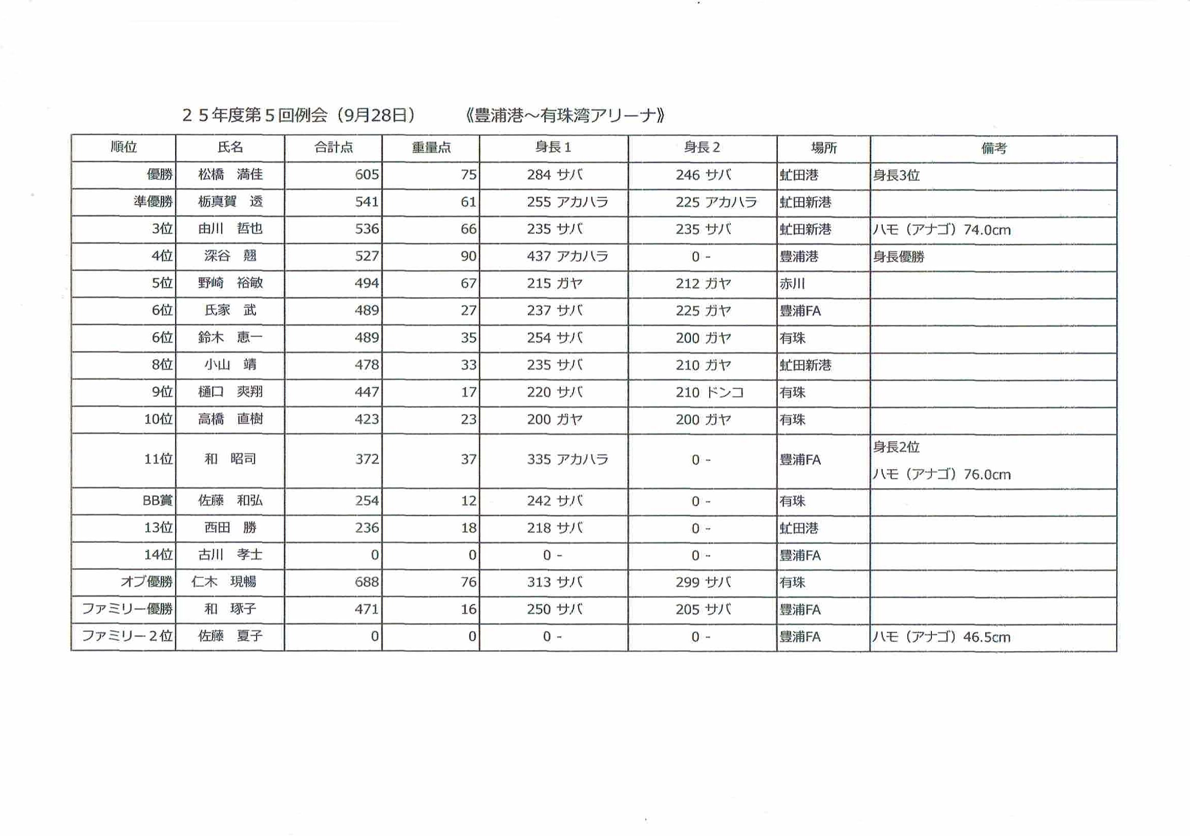 ファミリー優勝 和 琢子 471 16 250 サバ 205 サバ 豊浦FA