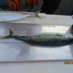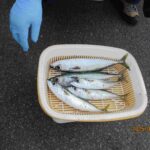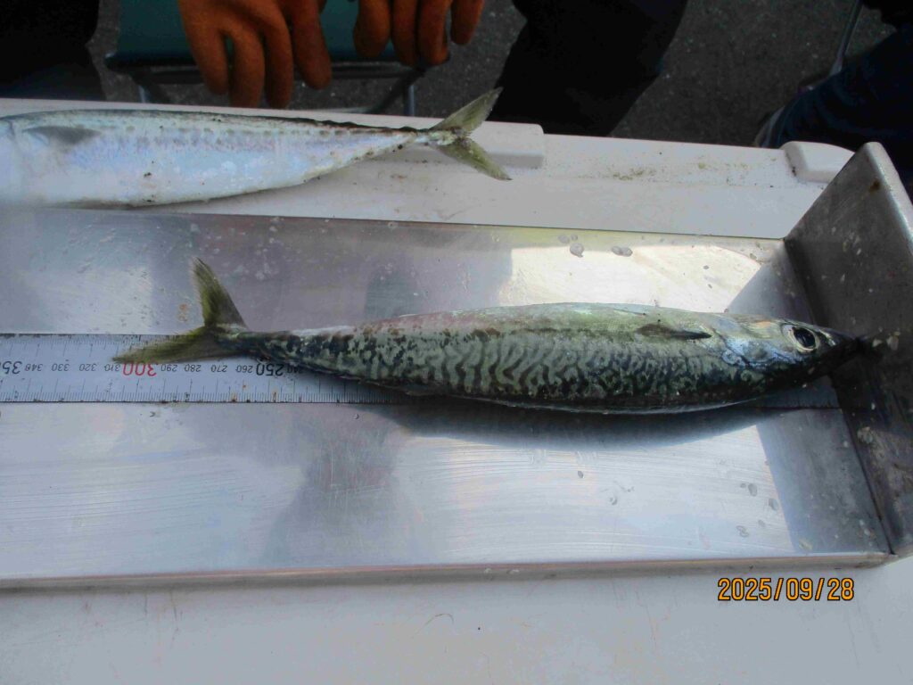 明け方から餌を小鯖の切り身に替えて投げると28.4㎝の鯖が食いついた。